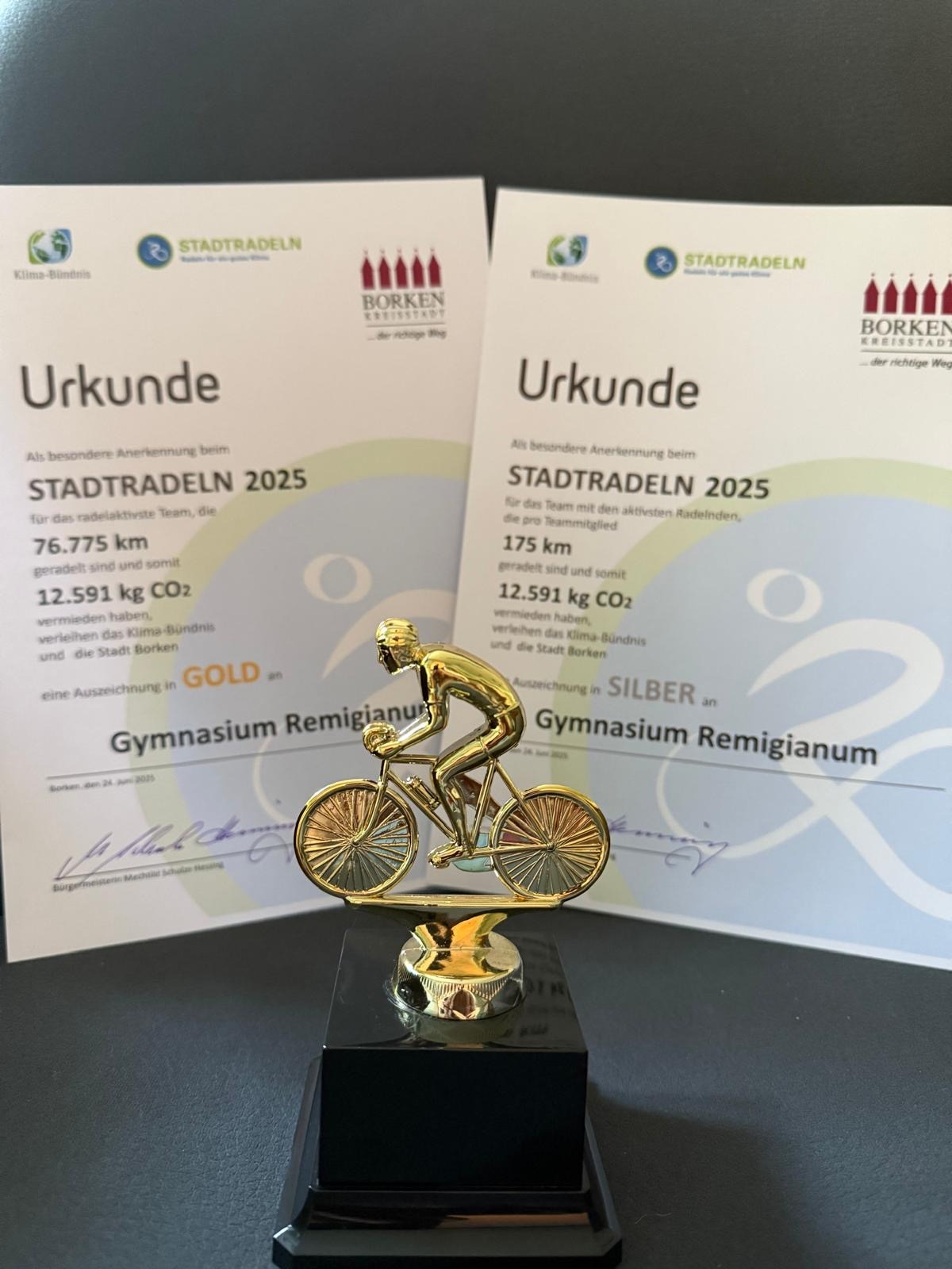Für 76.775 gefahrene Kilometer überreichte die Bürgermeisterin der Stadt Borken, Mechtild Schulze Hessing, der Delegation die Auszeichnung in Gold. Da die Remigianerinnen und Remigianer pro Kopf 175km gefahren sind, gab es zusätzlich eine Auszeichnung in Silber.