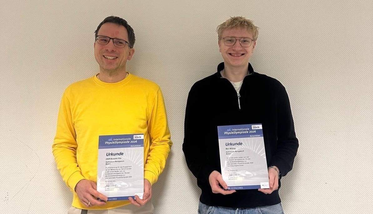 Im November nahm Ben Wilting (Q1) an der zweiten Runde der Physik-Olympiade teil, für die er sich als eine von 4 Personen im Regierungsbezirk qualifiziert hatte. In der 150-minütigen Klausur ging es z.B. um eine Fallmaschine, eine Wärmepumpe und Swing-By-Manöver in der Raumfahrt. Da Ben eines der besten Ergebnisse in NRW erreichte, erhielt er heute eine Urkunde und darf Anfang Februar an einem mehrtägigen Workshop im Forschungszentrum Jülich teilnehmen.