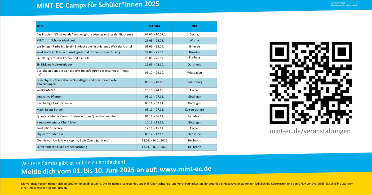 viele neue Events sind online – und somit auch die MINT-EC-Camps für das kommende Halbjahr! Der Bewerbungszeitraum läuft vom 01. bis zum 10. Juni. Mit dem Stöbern kannst du aber jetzt schon beginnen. Viele spannende Themen stehen zur Auswahl, von Laserphysik bis hin zum Design und Herstellung einer Schokoladenform im 3D-Drucker.